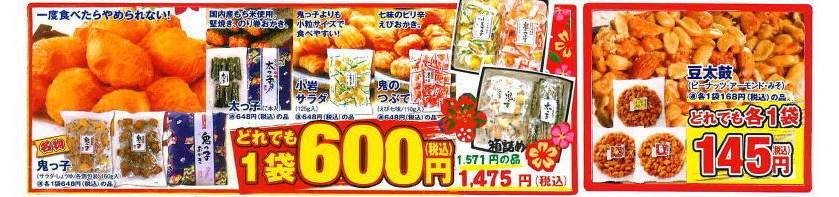 ![]() 鬼っ子・太っ子詰め合わせ 特大袋(鬼っ子420g・太っ子22本入) 通常価格3,706円 SALE価格3,490円(税込) |